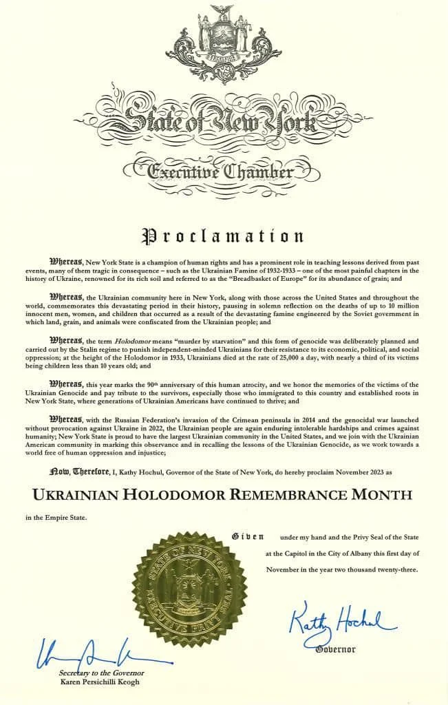 Американський штат Нью-Йорк видав прокламацію з нагоди 90-роковин Голодомору, де ще раз наголосив на визнанні Голодомору 1932−33 років геноцидом українського народу.