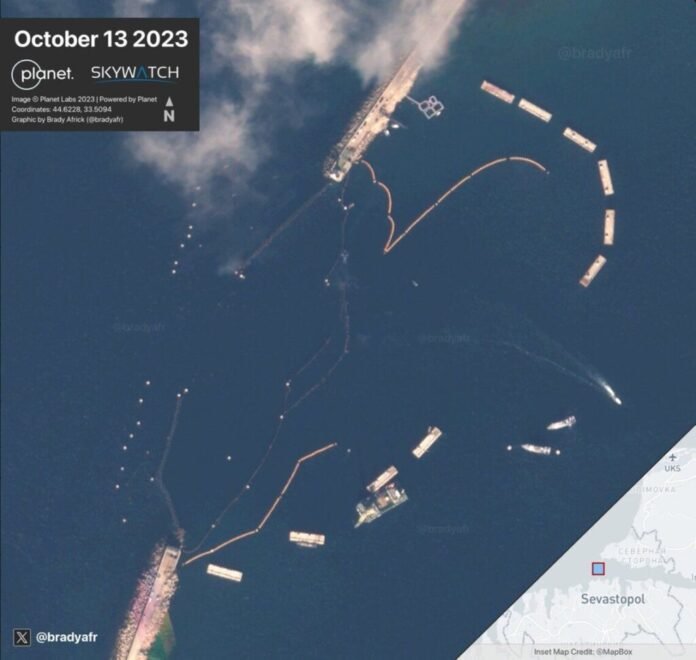 “Ось нещодавній погляд на загородження, які росія встановила на вході в Севастопольську гавань у Криму, щоб протистояти безпілотникам ВМС України”, – зазначив аналітик.