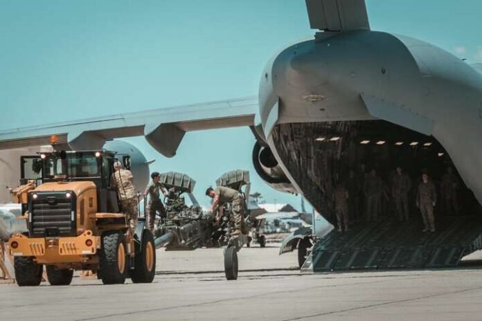 Вантаж зі 155-мм буксированими гаубицями M777 завантажили у військово-транспортний літак на базі в Каліфорнії.