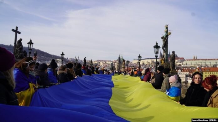 Акцію «живого ланцюга» у Празі проводять вже кілька років поспіль. Українці, які давно проживають у Чехії, та ті, хто втекли від російської війни, приходять також нагадати про повномасштабну агресію Росії проти України.