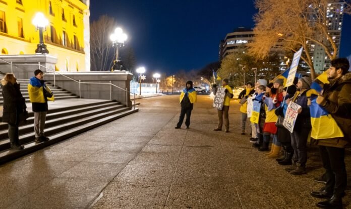 «Генеральне консульство України в Едмонтоні разом з Stand with Ukraine: Edmonton Rallies/Мітинги в Едмонтоні провели мітинг біля парламенту Альберти з вимогами посилити тиск з боку Канади на росію, щоб зупинити російську агресію, терор мирного населення та покарати винних у військових злочинах», – йдеться в дописі.