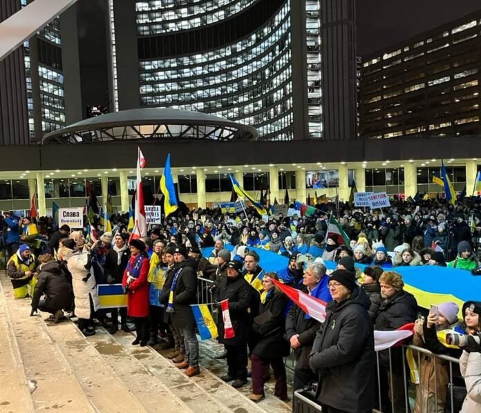 Понад 10 тисяч людей вийшли у десятиградусний мороз до центру Торонто, щоб приєднатися до «Мегамаршу» організованого Конгресом українців Канади – відділ Торонто з нагоди першої річниці повномасштабного вторгнення росії в Україну. Як передає Укрінформ, про це йдеться на фейсбук-сторінці Конгресу українців Канади – відділ Торонто (Ukrainian Canadian Congress – Toronto Branch).